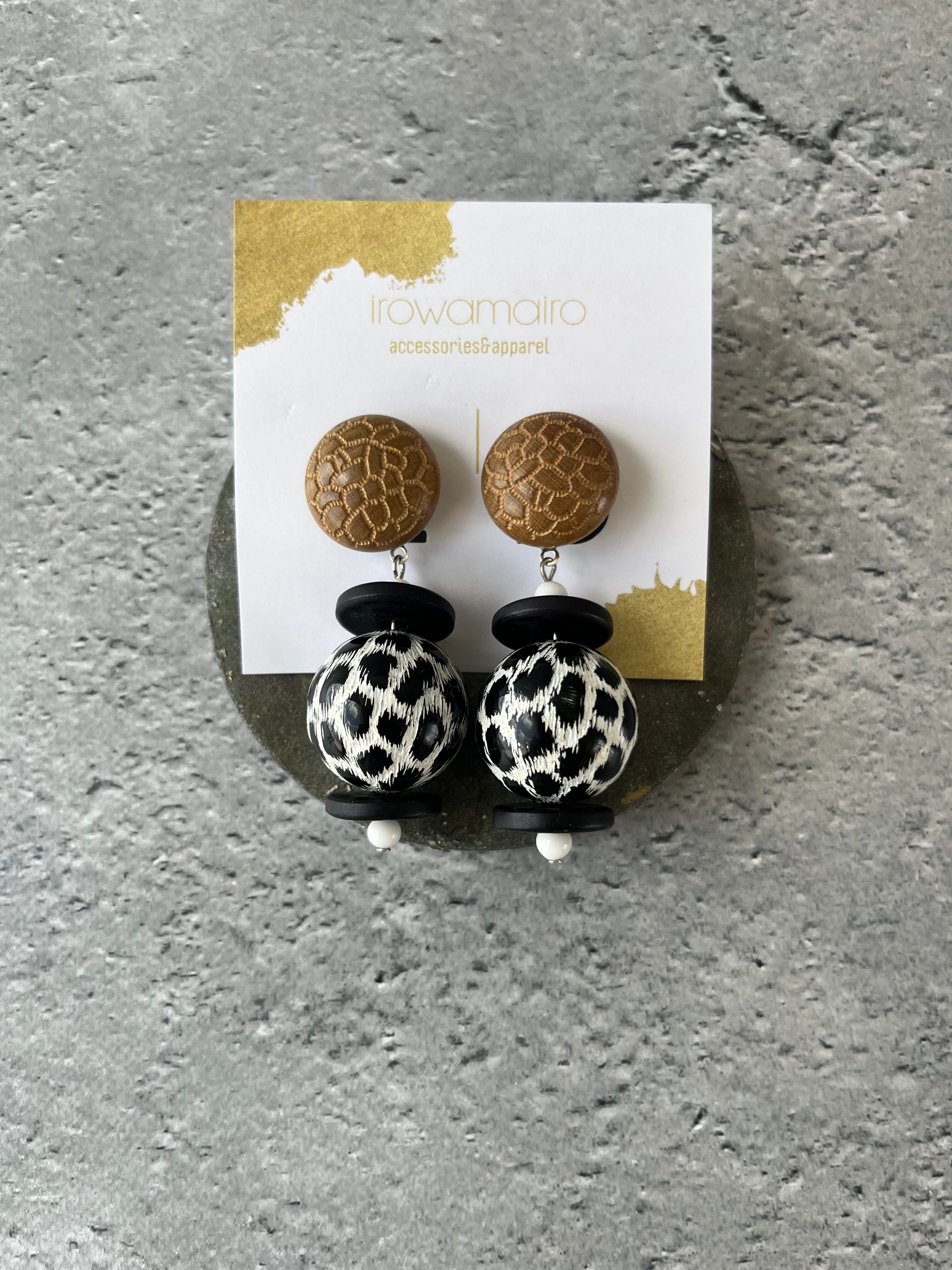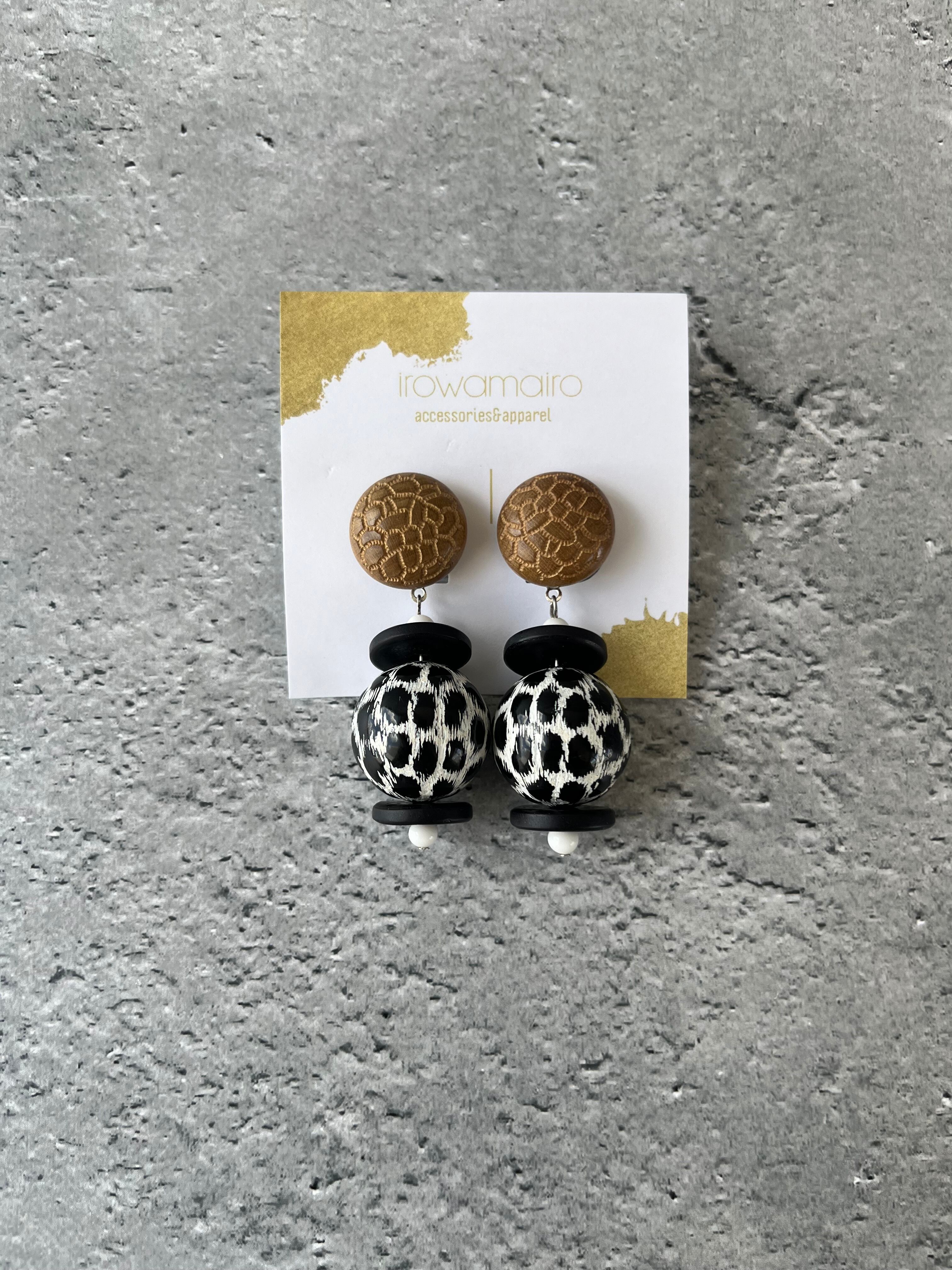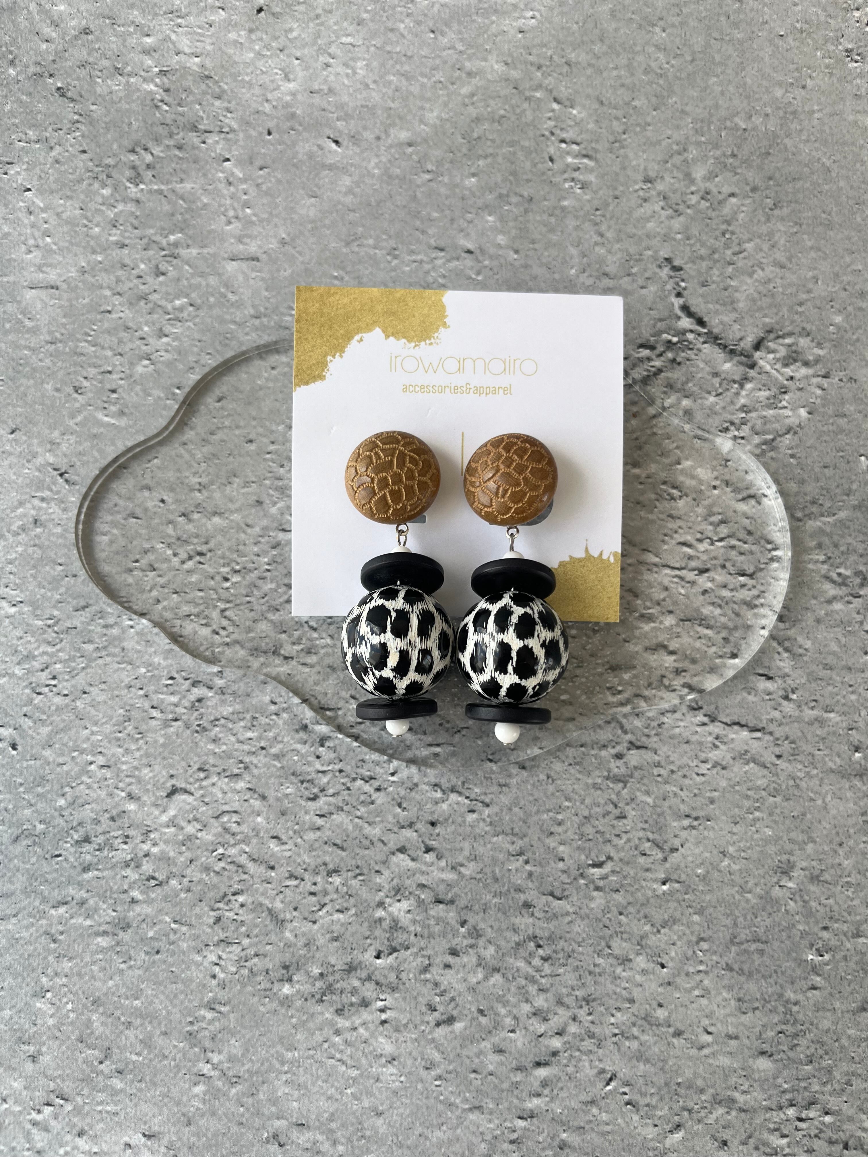 シックな印象のwhite × black のゼブラ柄のようなデザインに、クッキーのようなコロンとしたブラウンのボタンパーツを組み合わせてみました。
